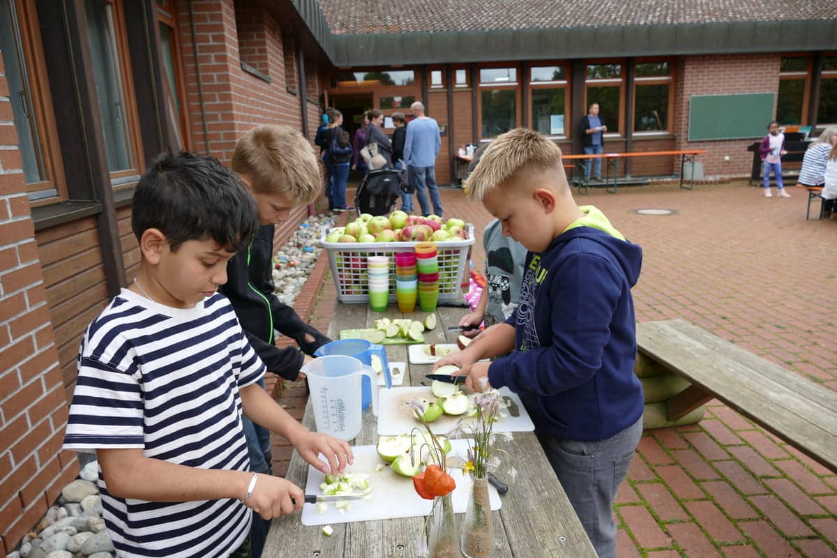 Das „Highlight“ des Tages war die Apfelpresse. Von Familie Hofmann und Frau Gunkelmann hatten wir viele Äpfel geschenkt bekommen, die von den Kindern mit Begeisterung ausgepresst wurden. Vielen Dank für die Ausleihe an Herrn Abendschein!