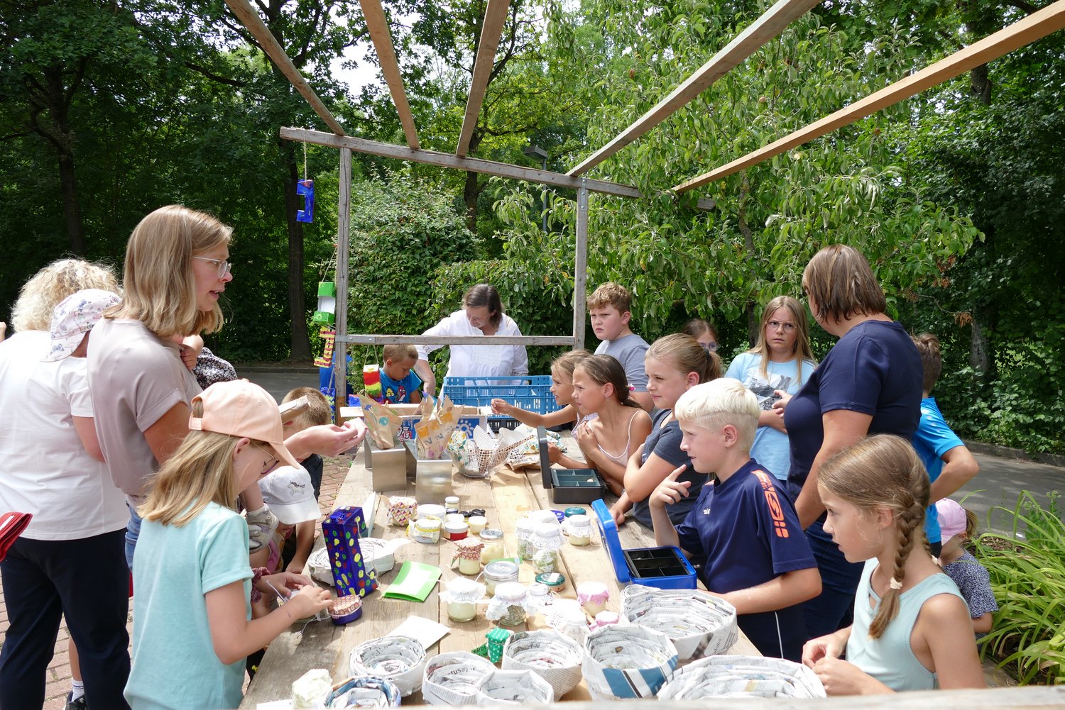Frau Assmann begrüßte die Anwesenden, bedankte sich bei allen Helfern und erinnerte an die Tombola und den Verkaufsstand der Schüler. Während der Projektwoche hatten die Kinder mit verschiedenen Lehrkräften Taschen mit „Mensch ärgere dich nicht“-Spielplänen bedruckt, Schüsseln aus Zeitungspapier geklebt, duftende Cremes und Seifen gerührt und Vogeltränken bemalt.