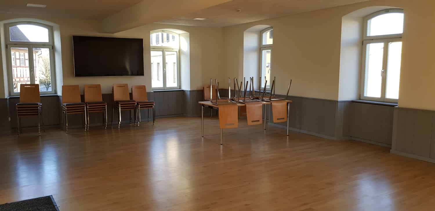 Zudem kann der ca. 60m² große Raum im Erdgeschoss mit Küchenzeile von allen Bürgern, Vereinen, Verbänden und Gruppierungen aus dem Stadtgebiet der Stadt Aub genutzt werden.