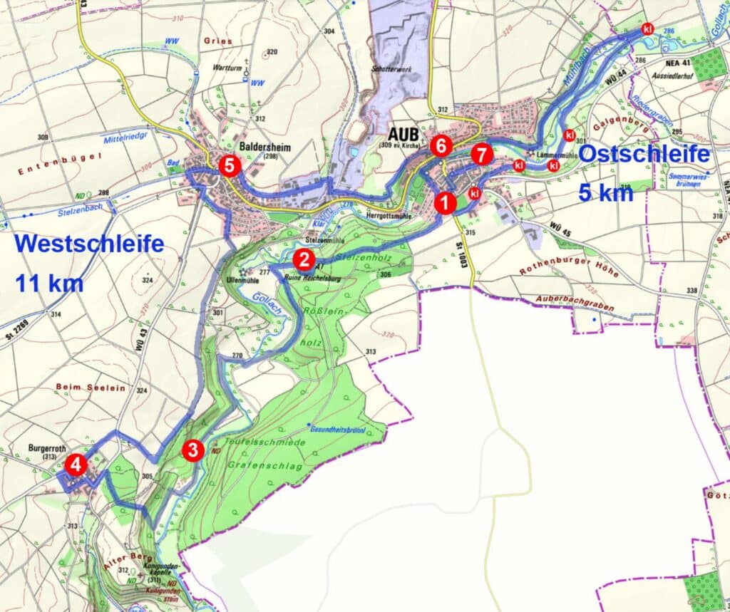 Entstanden ist ein Kulturwanderweg für Aub, Baldersheim und Burgerroth welcher eine Westschleife mit ca. 11 km und eine Ostschleife mit ca. 5 km umfasst.